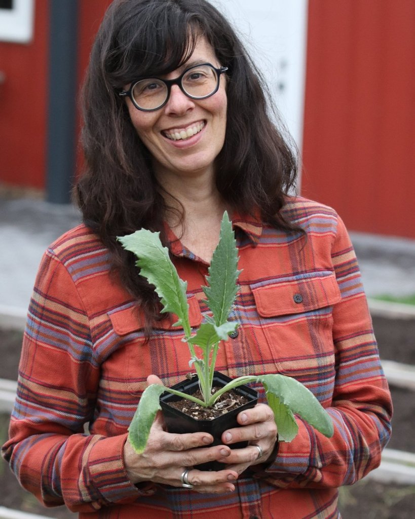 Artichokes are thistle-like perennial native to the Mediterranean that is a domesticated version of cardoon. It’s in the Aster family, so related to flowers including zinnias, sunflowers, cosmos, and prairie plants like black-eyed susans and New England asters. It puts out massive, sometimes 3’ long, leaves that are a silvery green, deeply veined and pointy. Some varieties can be a bit thorny, a nod to their cardoon heritage.