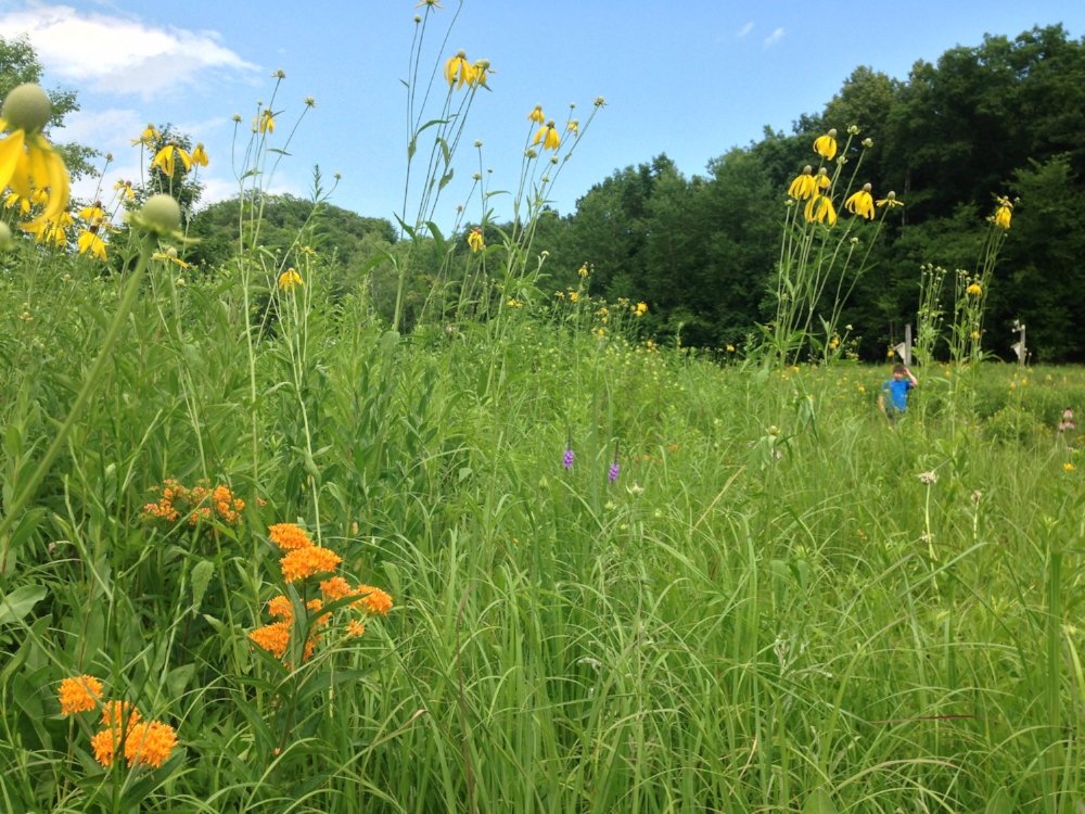 A feast for the eyes was our planted prairies at our ‘farm’ we once owned on the bluffs of the Mississippi River in Wisconsin. Butterfly weed (orange) in the foreground with grey-headed coneflower (yellow) and a hint of hoary vervain (purple) in the middle of the photo.