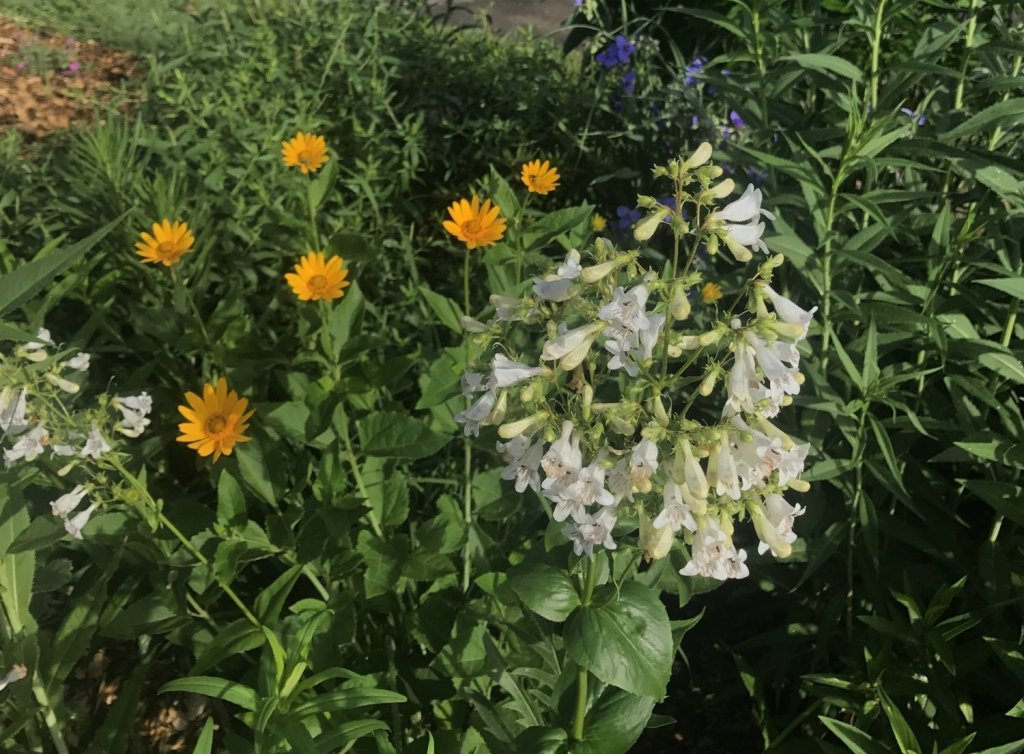 The white foxglove beardtongue has been known to even attract hummingbirds to our gardens! Seen here with some early sunflower (Heliopsis sunflower) and in the background a splash of Ohio Spiderwort. This prairie remnant one year earlier was less than 2 dozen one gallon pots of prairie plants we moved from our farm to our new home, and this is the first summer it bloomed here. Talk about hardy and resilient plants.