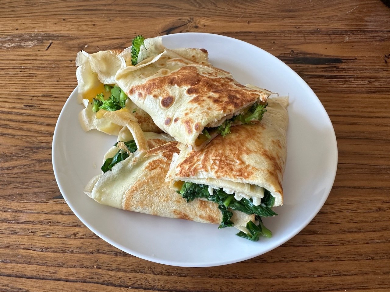- Fold the crepe into thirds, and flip in half to continue to cook and melt the cheese. Serve immediately!