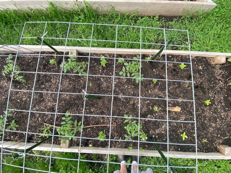 I made the best use of what we already had, and it turned out I just happened to have the right lengths for the space I’d already allocated for determinate tomatoes. That was lucky, because it usually doesn’t work out quite that well! I used a 6’ and 8’ long panel and spaced the plants out around 28” apart with 30” spacing between rows. This is pretty similar to plant spacing for my indeterminate tomatoes too, though recently I’ve read you can space determinate plants closer together.