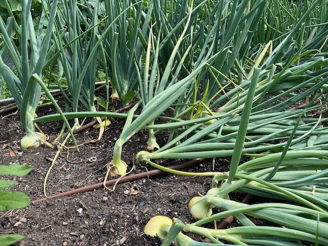 Some onions are as large a softballs, though let’s be honest: how many dishes besides homemade salsa or ketchup require a 2-3 lb onion? But will the later plantings produce onions large enough in time for curing? They are bulbing, responding to our long day length (I always grow long-day onions), so that is a good sign