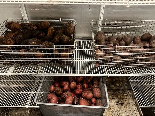 Potatoes are an odd exception to my produce aisle visual because they are presented alongside drier crops like onions, winter squash, and sweet potatoes in the grocery store. But for best quality and long-term storage, they require humidity. I imagine they came out of a damp cooler to travel to the store. And, they are stored differently than our other vegetables – just tossed into a bin inside our damp root cellar, no burying needed.