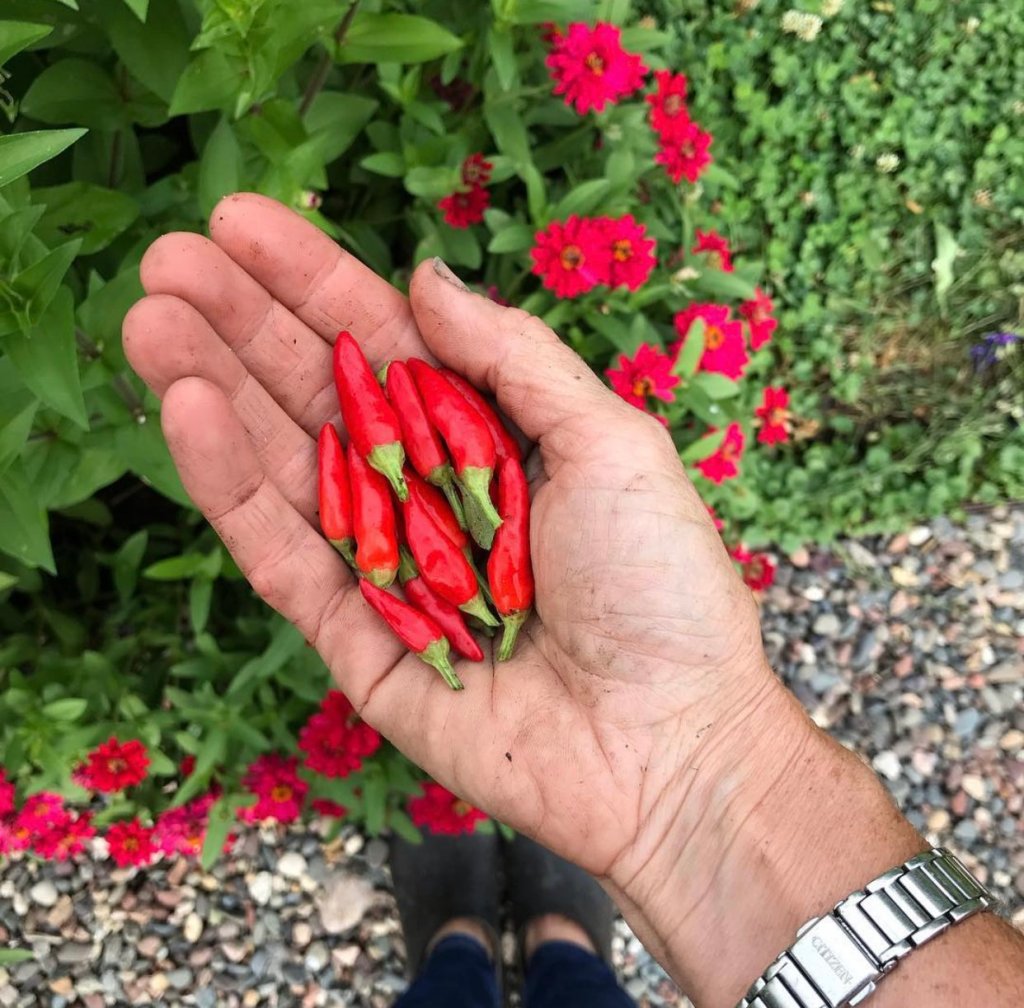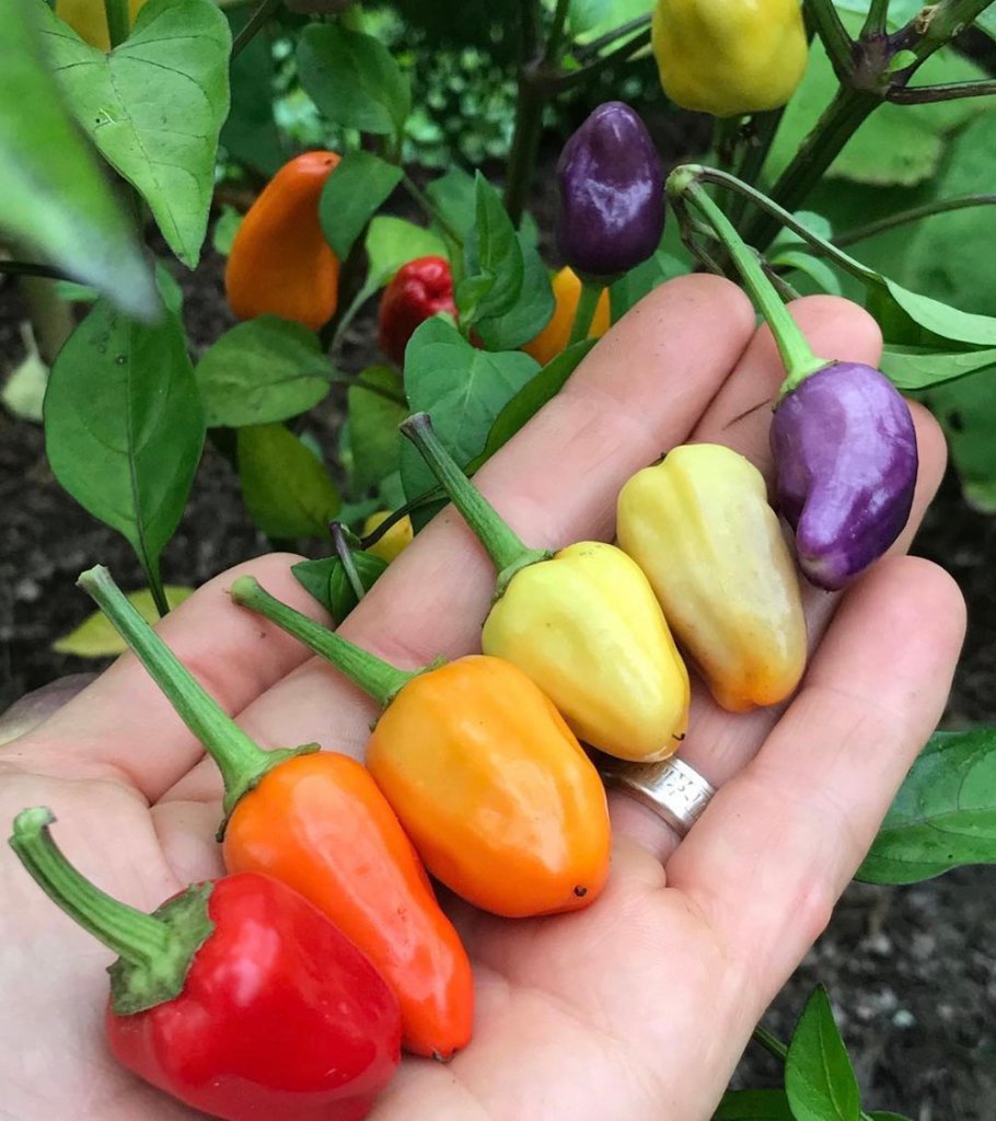 Chinese 5 Color — This is a super fun and quite hot pepper to grow. So if you only need a little bit of heat but want the fun of a rainbow, this is your pepper. We don’t have a palate for super hot foods, so this one is grown entirely for looks.