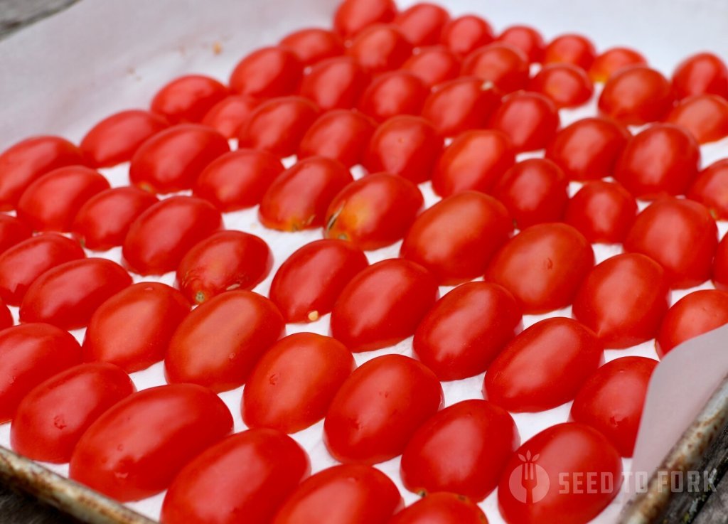 • Using ripe roma, plum, or paste tomatoes, cut off the top of the tomato and then cut in half lengthwise. You could even use this method for cherry tomatoes, too. Use what you have!