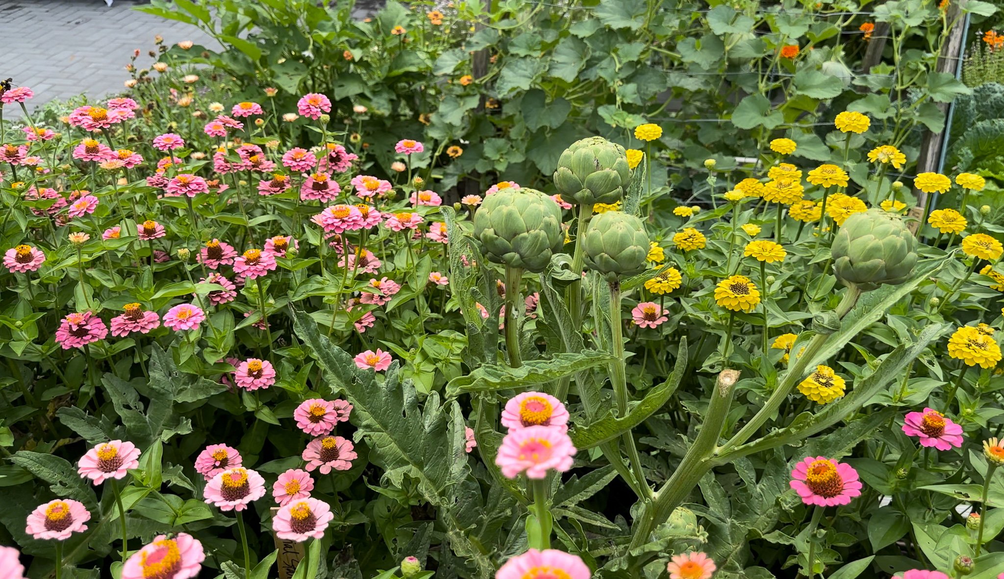 This bed could have been called a zinnia bed with a touch of artichokes. Actually, it really was a flower bed, as I let many artichokes fully flower just for the experience.