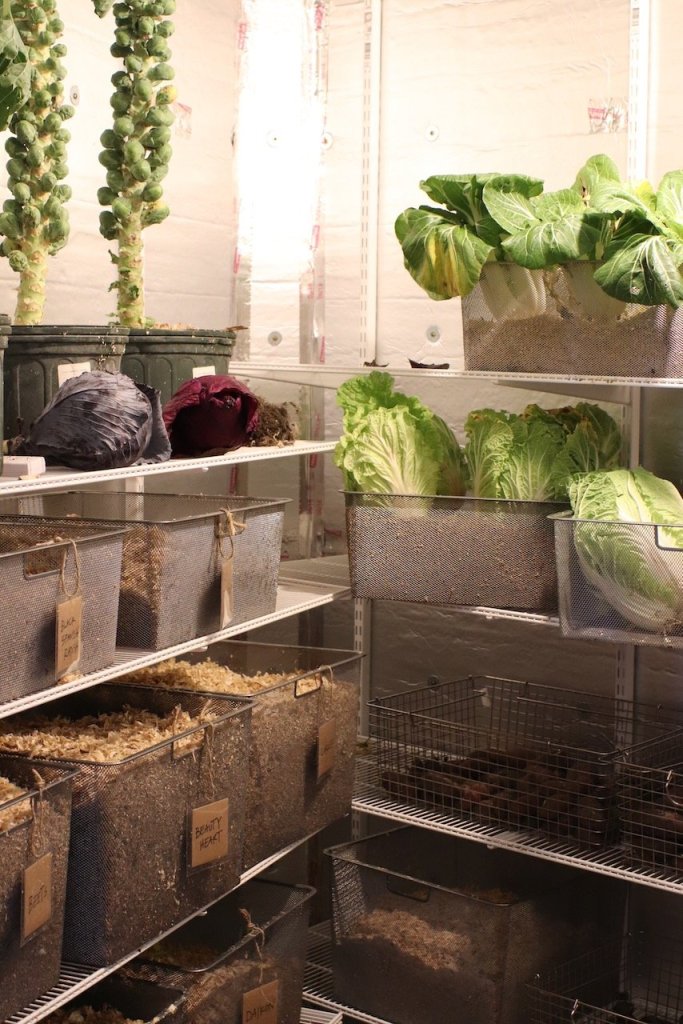 Roots and other storage vegetables require different types of storage conditions, depending on the vegetable. Roots require similar conditions to their outdoor growing conditions: a dark, moist environment where humidity approaches 100%. Imagine creating a space that emulates still being in the ground after a fall frost. It’s chilly, but not freezing, you’re surrounded by damp but not soaking soil, and it’s pitch black. All those things you’ve plucked from the ground like potatoes, carrots, beets, parsnips, rutabaga, winter radish, and so on need a root cellar with more or less those conditions to remain at peak harvest conditions while storing. Included in this damp, moist environment are other veggies — mostly brassicas — that are known to store well including brussels sprouts, cabbage (several kinds), leeks, kohlrabi, broccoli, and cauliflower.