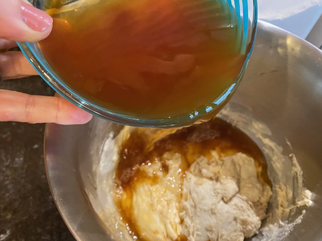 - Microwave the liquids (water and malt syrup for 45 seconds, then add to starter with rest of ingredients.