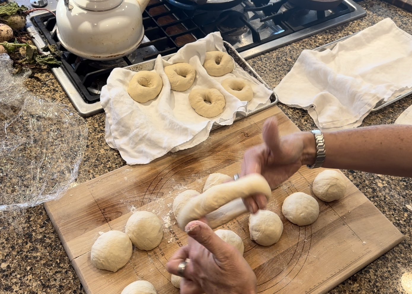 - With your index and middle fingers, roll the hole out as wide as the dough will give, making quick circles with your hands to stretch and shape the bagel hole. Place all bagels onto a linen or cotton towel for proofing. Stretch one more time before covering with plastic wrap for proofing.