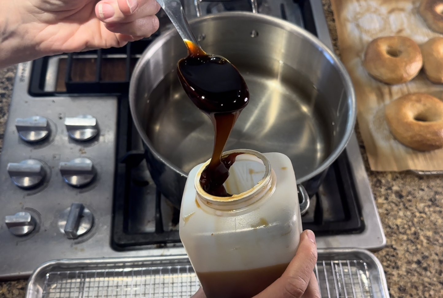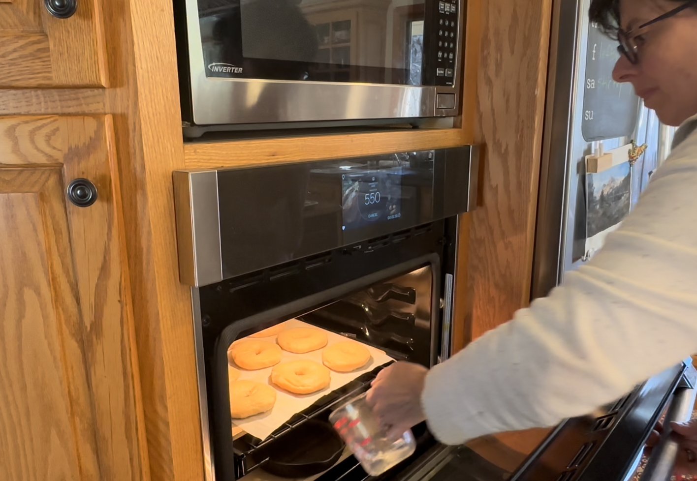 - Boil a few ounces of water for 60 seconds in microwave while the second set of bagels are boiling in the malt syrup water. As soon as you add the bagels, pour the water into the hot skillet and promptly close. We bake on convection, I recommend using it if you have it.