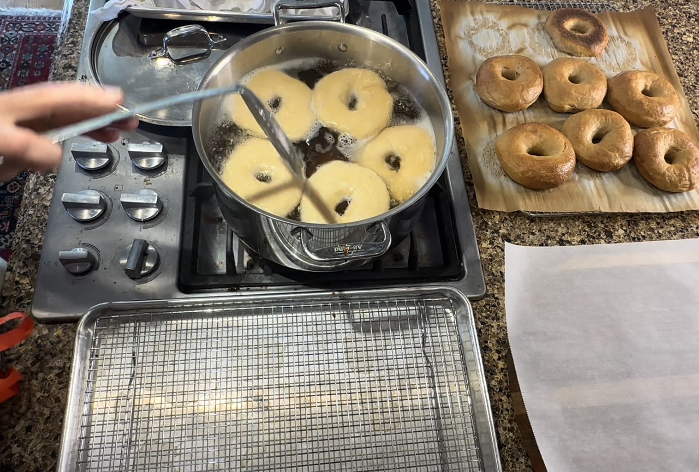 - Boil for 45 seconds on each side and then place on a wire rack to drain. I boil 5 the first time and 4 the second. Turn water off (you’ll need it in about an hour when the oven is ready to bake the other half).