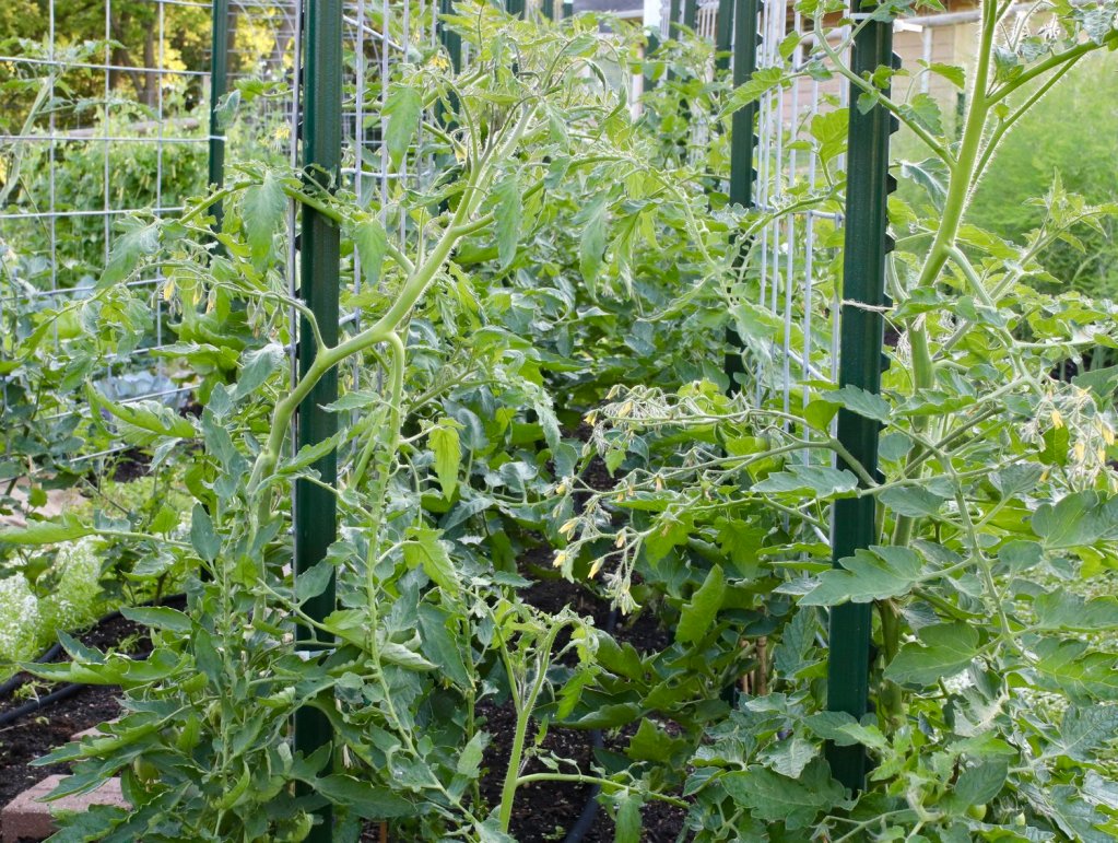 While not all the tomatoes were tall enough to reach the panel just yet, we used bamboo stakes to help get the plants up to the panels. By dong this, we used the minimal amount of cattle panel for the trellis.