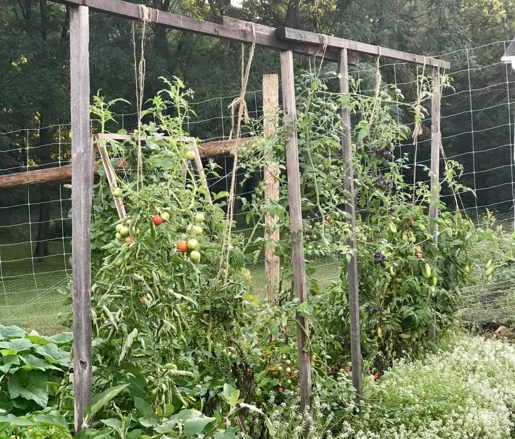 With the explosion of tomatoes in our garden this year, it really forced our hand on how we will manage over 25 indeterminate varieties. Vertical gardening has always been a large part of our growing adventures. And there are endless ways to grow up. Just use your imagination, and your resources. And that’s what we did: we pivoted this year from our single leader twine setup to a new method.