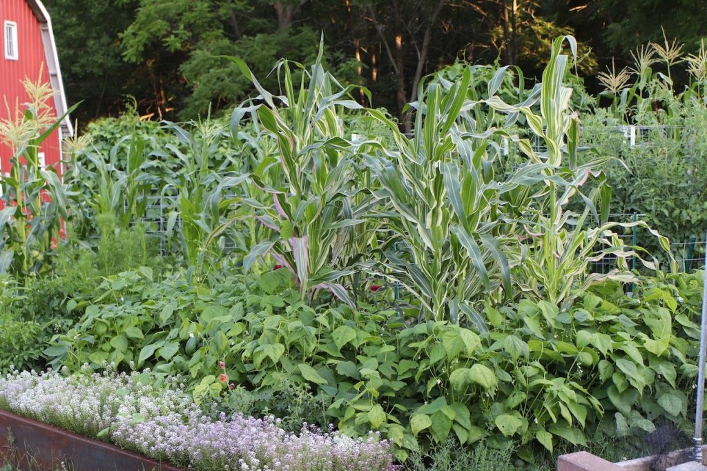 I didn’t expect to love this triangle bed quite as much as I am, but here we are. The thing that has surprised and delighted me is just how completely full it has become in the past three weeks. The beans are bumping right up to the corn on one side and the alyssum or onions on the other side. It’s like a stuffed serving of beautiful. The beans are climbing a little, which is somewhat unusual since I’ve been growing these from saved seed since 2019. Dapple Gray beans are a bush type. Only some of the plants seem to be wanting to run, so I’m letting them reach for the skies. I won’t do anything but let this bed ride out the season.