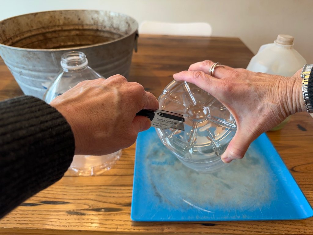 Cut gallon jugs about in half, with the bottom tall enough for several inches of potting soil.