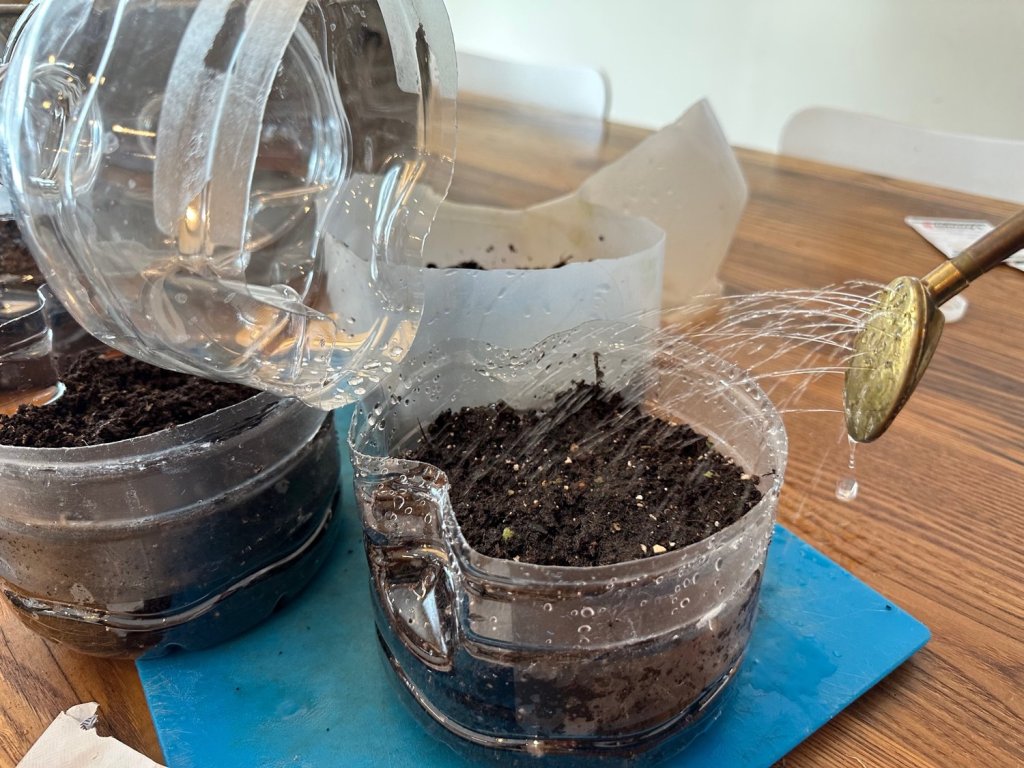 or seeds that needed covering, I then added more potting soil on top (calendula). I did make a mess watering them in, but I wanted this very gentle stream. Doing this in the kitchen sink would have been smarter.